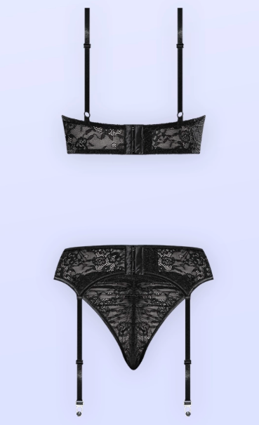 The demi bra teases with its intricate lace cups, offering a tantalizing glimpse of skin, while elastic adjustable strapsand a hook & eye back closure ensure the perfect fit. The lace garter, adorned with a satin black bow, adds a flirty, elegant touch. Completing the look, the matching lace tanga embraces every curve, leaving little to the imagination.