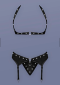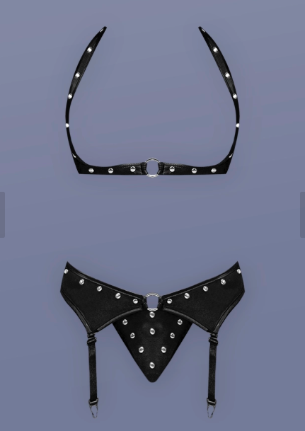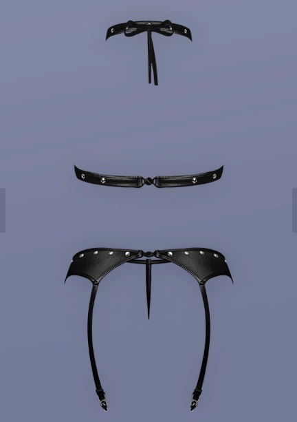 The open halter shelf bra features a Velcro neck closure and a sliding butterfly clasp in back, offering an adjustable, seductive fit. The attached garter belt hugs the waist beautifully, while the adjustable straps with metal clips easily attach to stockings. The matching G-string completes the lookāperfect for nights of power, play, and passion.