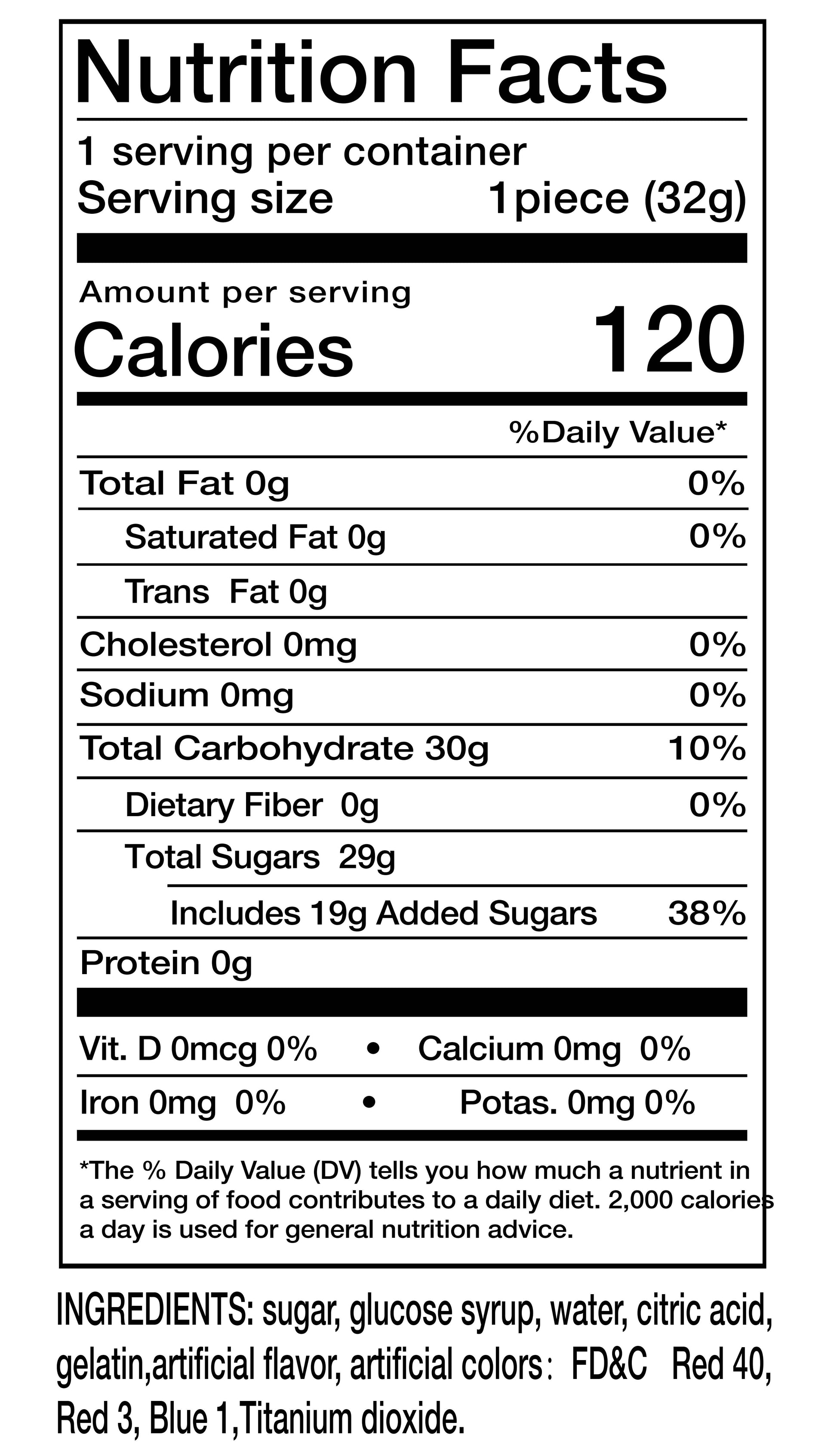 Ingredients: Sugar, Glucose, Water, Citric Acid, Gelatin, Artificial Flavor, Artificial Colors (FD&C Red 40, Red 3, Blue 1), Titanium Dioxide.