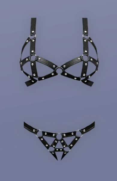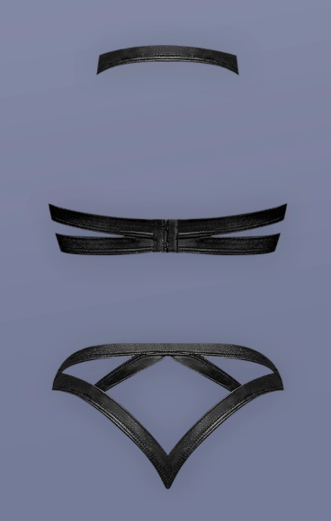 The strappy detailing with metal ring accents highlights every curve, while the hook-and-eye closures at the neck and back ensure a flawless, adjustable fit. The matching strappy panty mirrors the daring design with its cutout sides and ring details, creating a teasing, unforgettable look.