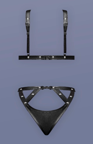 Designed to highlight every curve, it features open cups, metal ring accents, and adjustable shoulder straps for the perfect fit. The cutout Brazilian-back panty teases just the right amount, while the hook-and-eye closure in the back ensures a secure, flattering feel.