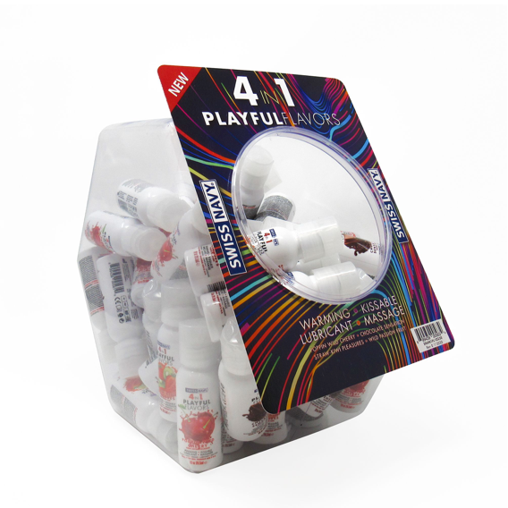 Swiss Navy 4 In 1 Playful 1 ounce Flavors Assorted 50 Count Fishbowl from M.D. Science. Point of purchase impulse sales display of Swiss Navy 4 In 1 Playful Flavors Warming Lubricants. Kissable massage. Assorted flavors included in the fishbowl display assorted flavors: Poppin Wild Cherry, Chocolate Sensation, Strawberry Kiwi and Wild Passion Fruit. Clear Plastic Fishbowl Point of Purchase Display comes with a colorful header. Indications for use: water or silicone based personal lubricants are used by medical professionals to facilitate gynecological and hospital procedures where additional lubricant is needed. Swiss Navy Lubricants are intended for penile and, or vaginal application to enhance natural lubrication and facilitate intimate sexual activity. These lubricants are compatible with both Natural Rubber Latex Condoms and Polyisoprene Condoms.These products are not compatible with Polyurethane Condoms. Directions for use: apply as desired to be lubricated. Ingredients: Glycerin, Deionized Water, Flavor. Please note not a contraceptive or spermicide. Store at room temperatur 68 degrees to 77 degrees. Keep out of reach of children. M.D. Science - Swiss Navy. Made in the USA. Categories: Health and Beauty Aids, Adult Party Supplies, Lubricants, Flavored Lubricants, Warming and Tingling Lubricants. 2023.